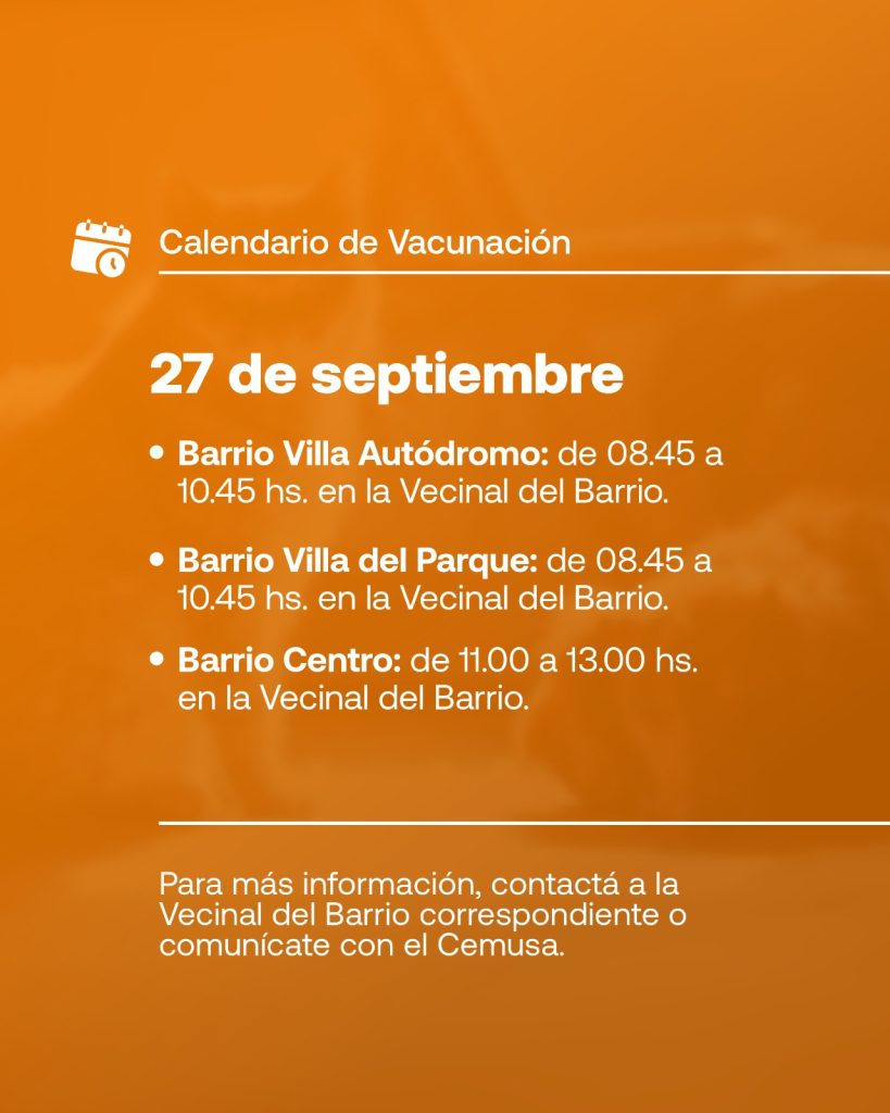 La Municipalidad de Sunchales informa que el próximo sábado 27 de septiembre se llevará a cabo la última jornada de vacunación antirrábica para felinos y caninos, machos y hembras, a partir de los 6 meses en barrios Villa Autódromo, Villa del Parque y Centro.