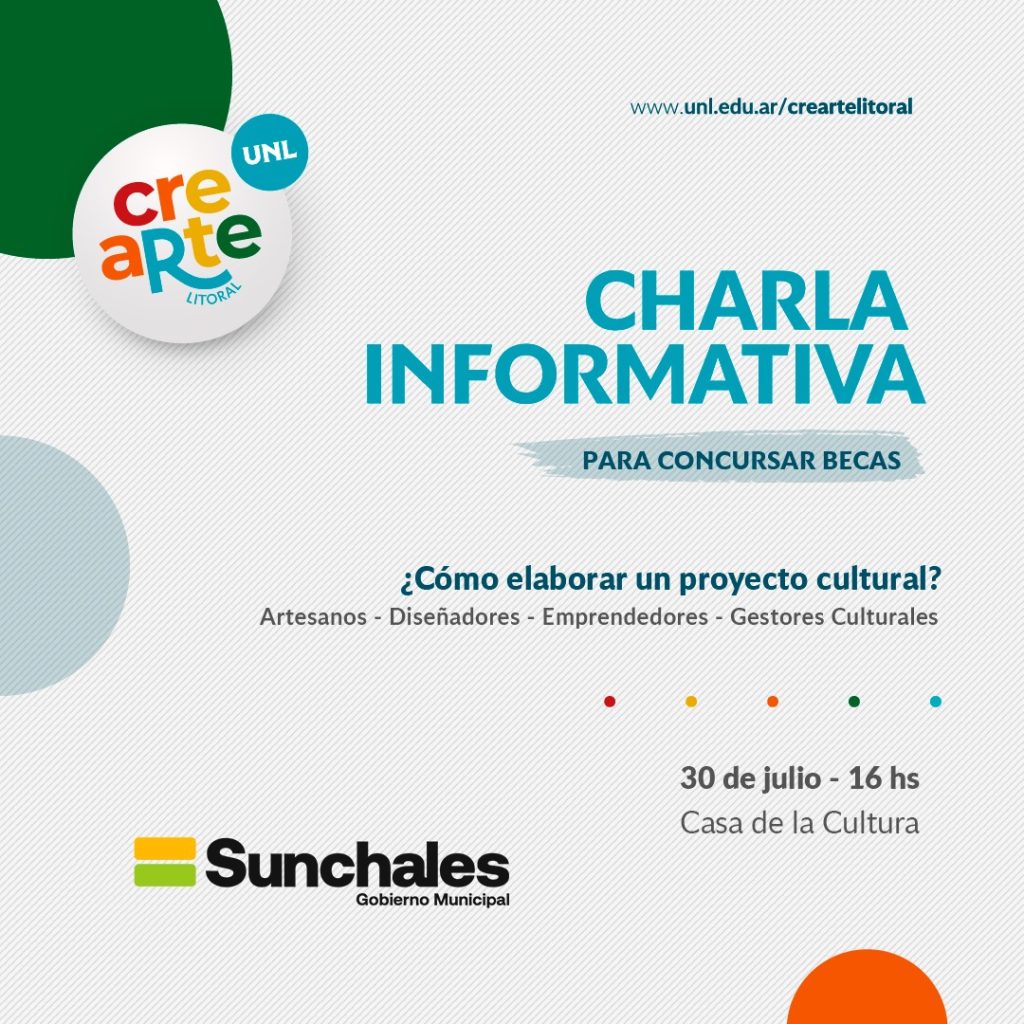 La Municipalidad de Sunchales desde la Subsecretaría de Cultura y Educación invita a todos los interesados a participar de charla informativa del programa «CreArte Litoral», un fondo de becas concursables de creación y formación, que es organizado por la Universidad Nacional del Litoral (UNL).