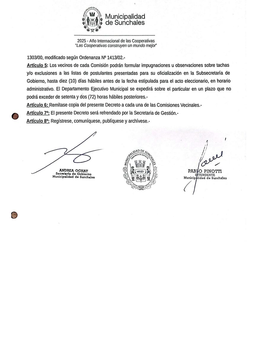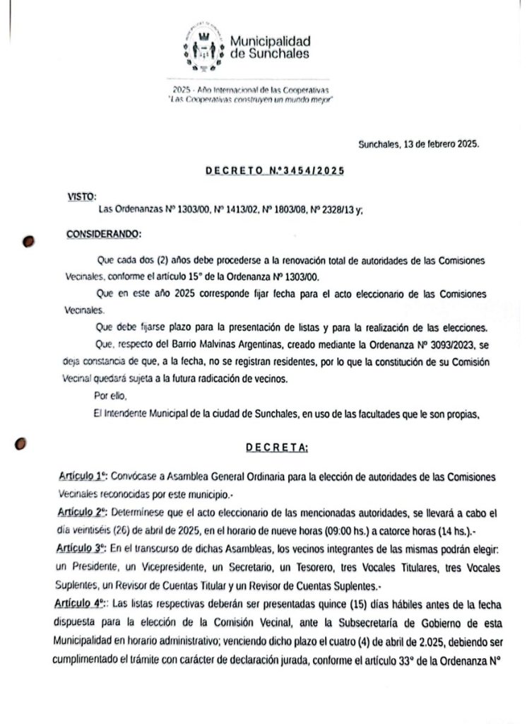 La Municipalidad de Sunchales, a través de la Secretaría de Gobierno, informa a la comunidad que, conforme al Decreto 3454/2025, se convoca a elecciones para la renovación de autoridades de la Comisiones Vecinales.
