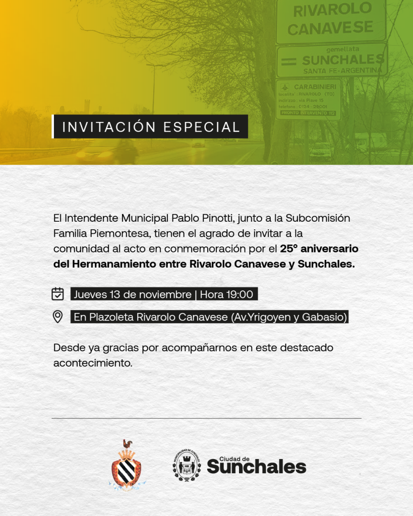 Te esperamos en el acto por el 25° aniversario del Hermanamiento entre Rivarolo Canavese y Sunchales.